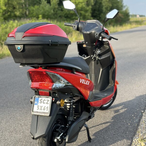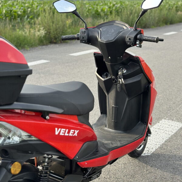Skuter elektryczny Velex Volter posiada wiele dodatkowych funkcji, takich jak oświetlenie LED, cyfrowy wyświetlacz prędkości i poziomu naładowania baterii, a także system alarmowy dla dodatkowego bezpieczeństwa. Przestronny schowek pod siedzeniem umożliwia przechowywanie niezbędnych rzeczy podczas podróży.